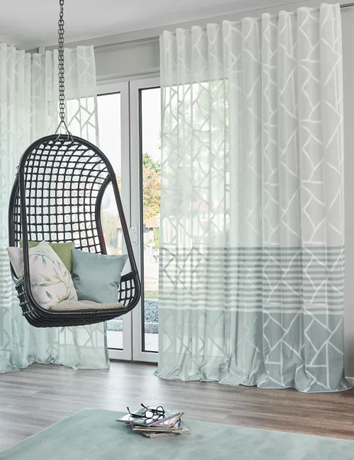 Leichte, helle Stoffe wie Voile oder transparente Gardinen, die bis zum Boden reichen, strecken optisch und lassen Räume großzügiger erscheinen.